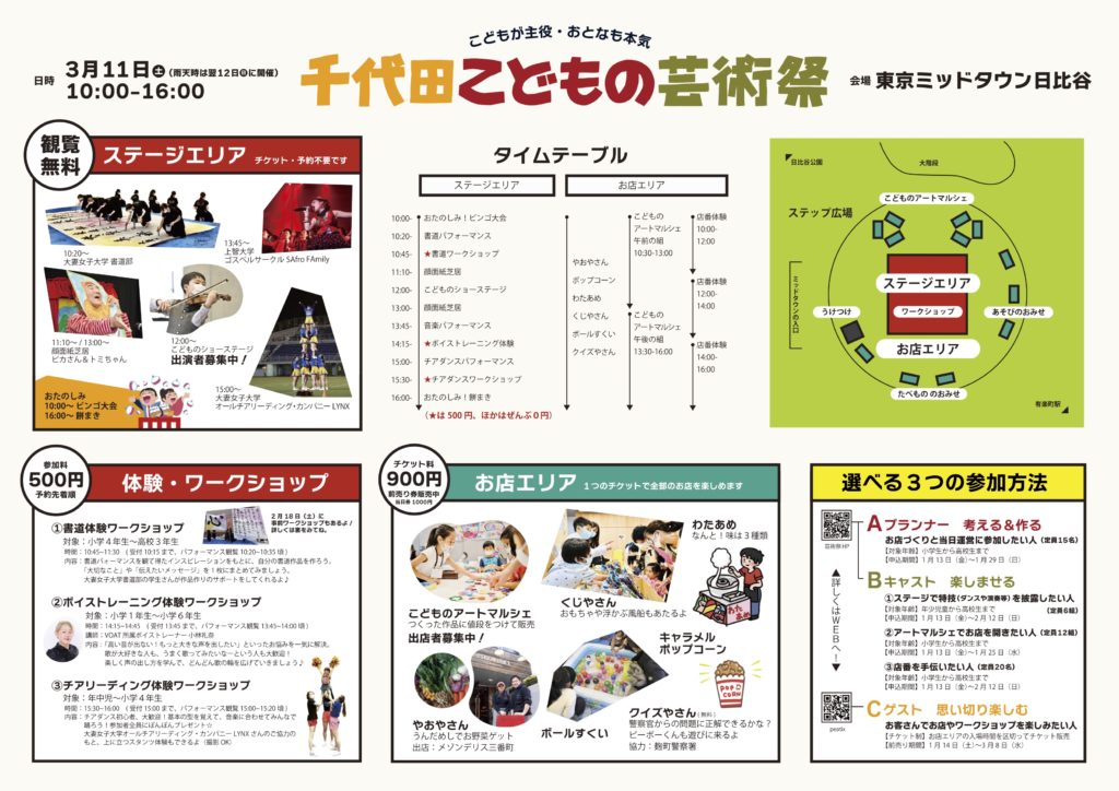 「千代田こどもの芸術祭」のコンテンツ詳細やタイムスケジュールについては、チラシをご覧ください。