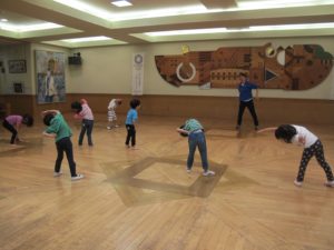 まずは準備体操。先生の真似をして動こうとがんばっています。