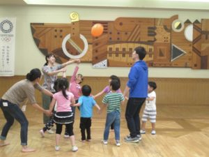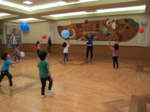 最初は、一人で風船を落とさないようポンポンとあげる練習をしました。