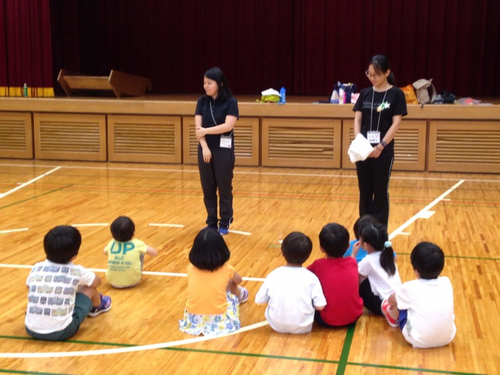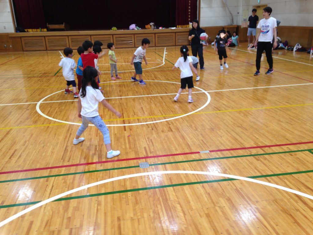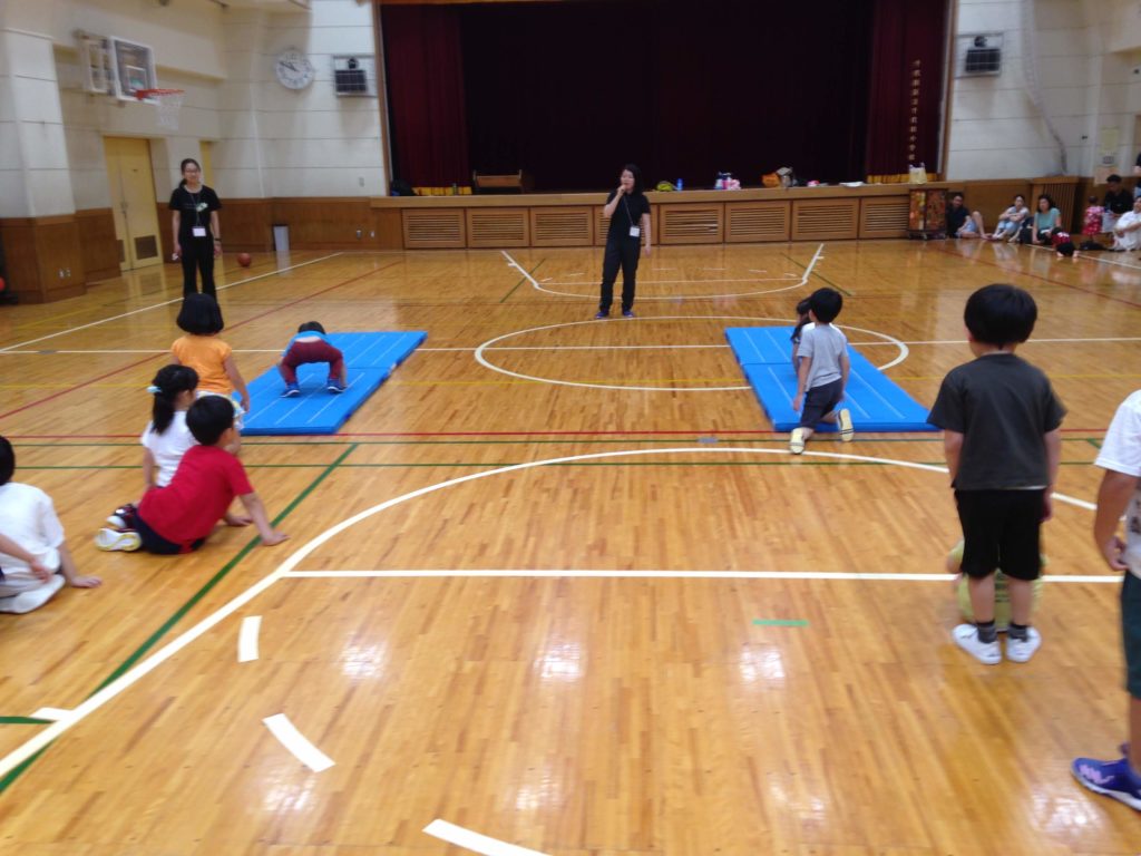 実際に小学校の体育館で体育の学習をするので、小学校での授業イメージを掴んでもらうことが目的です。