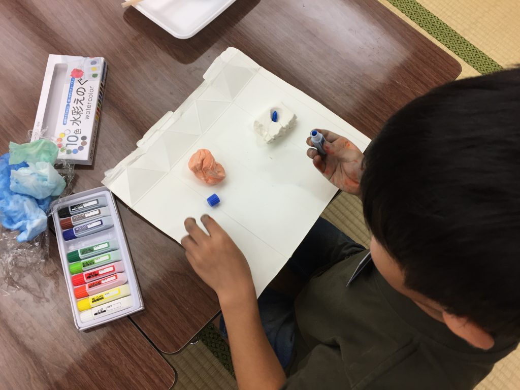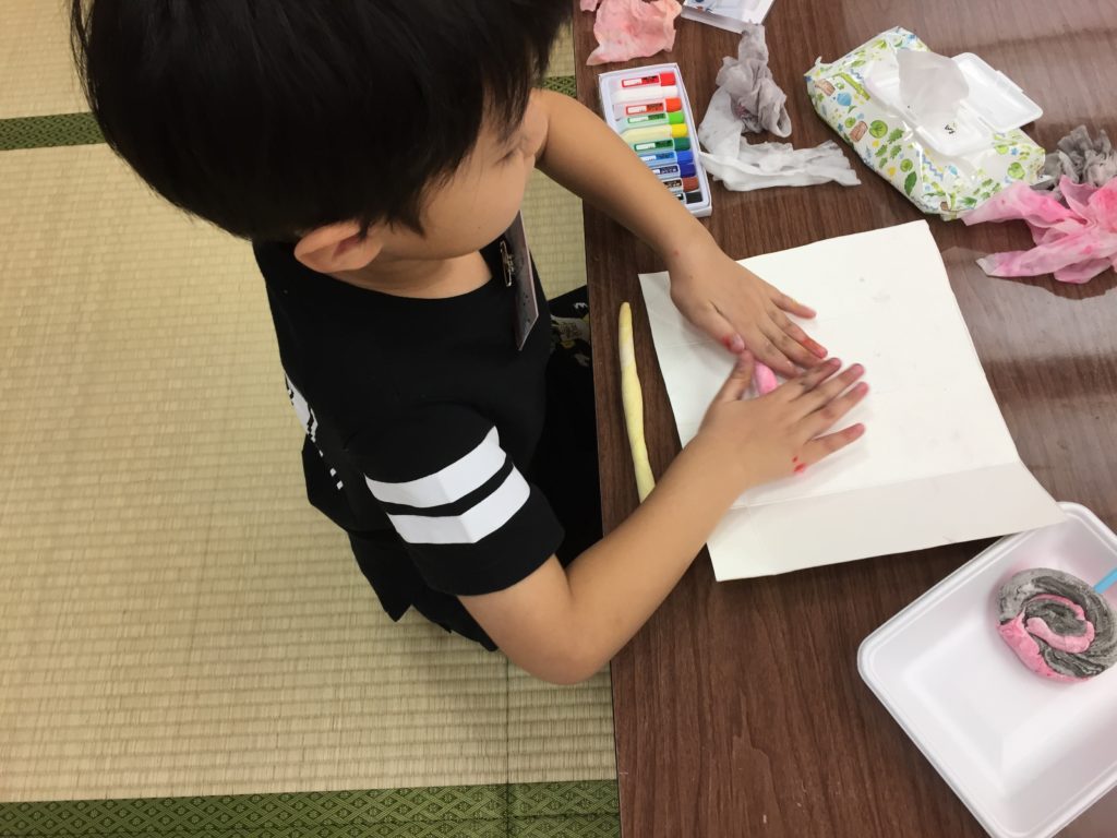 自分の机に戻り、好きな色2色を選んで、紙粘土に色をつけていきます。手が汚れるのを防ぐために、絵の具を包み込みながらこねていきましょう。