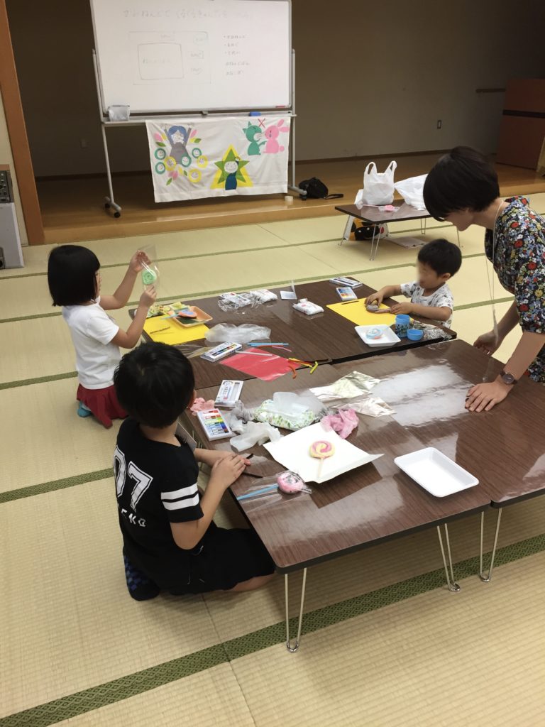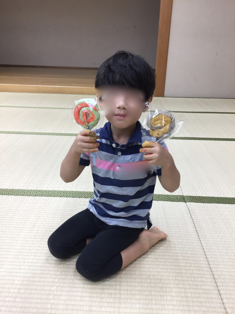 紙粘土に絵の具で色をつけて、ぺろぺろキャンディーを作る授業です。