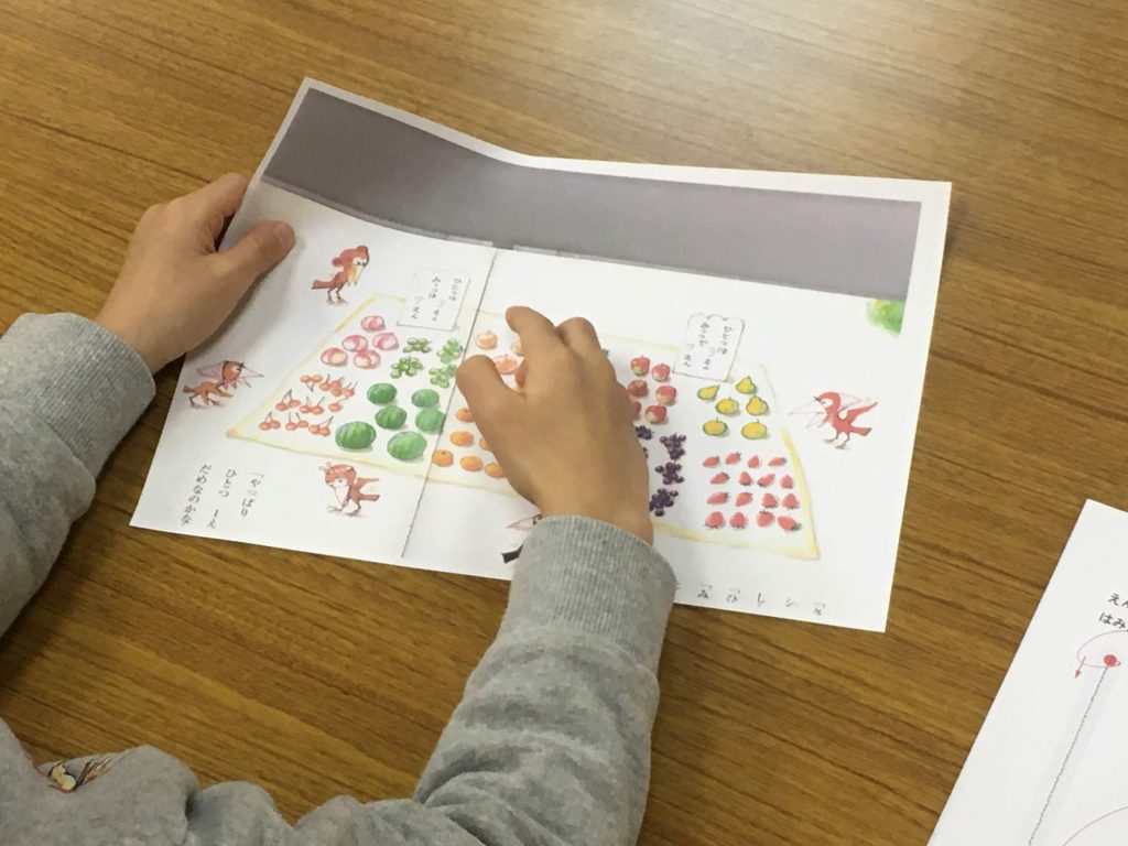 それぞれ八百屋さんのイラストから果物の数を数えていきます。 鉛筆でチェックしたりうまく数えれるように工夫しています。