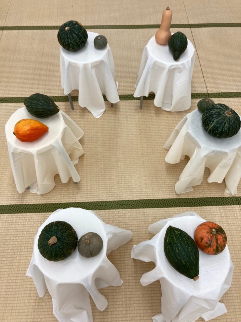 様々な種類や形のかぼちゃに触れて、気付いたことを親子で共有していきました。