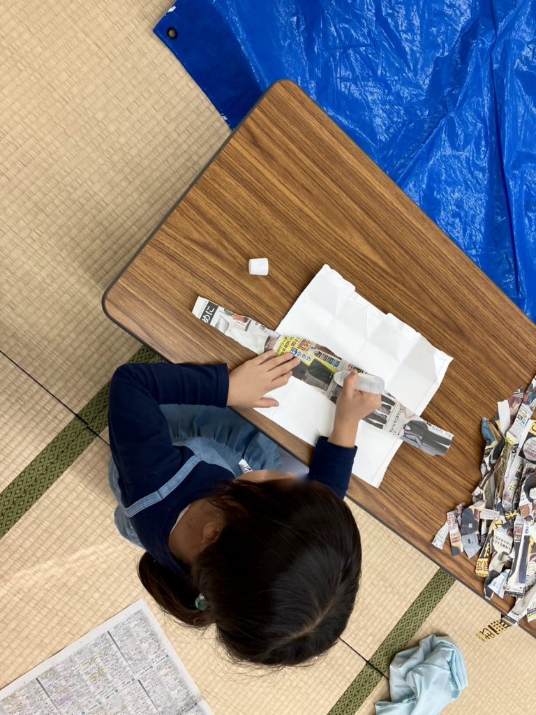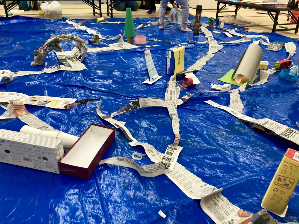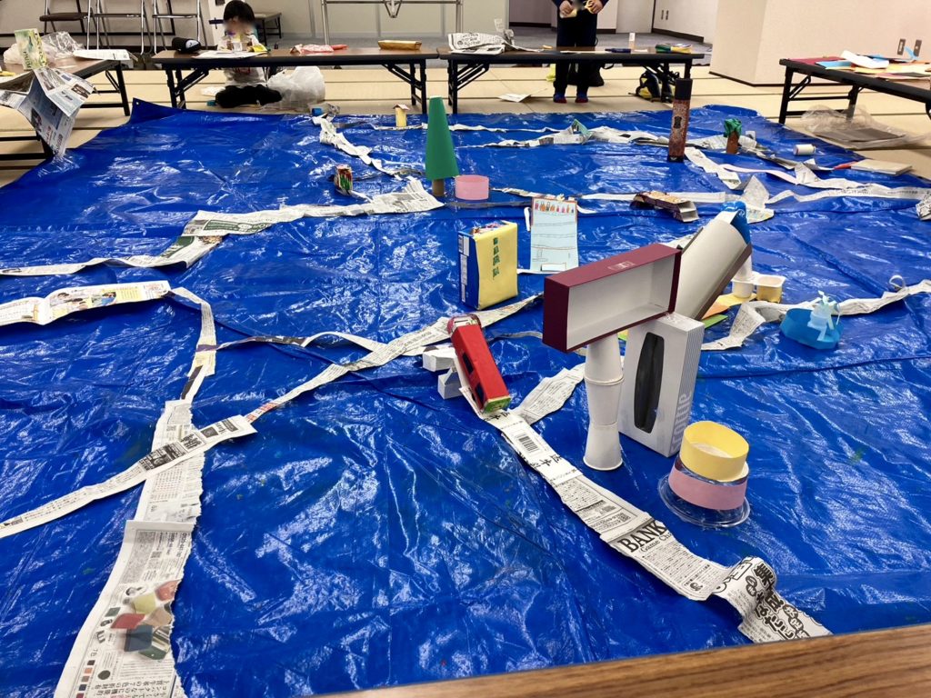 ちぎった新聞紙をつなぎ合わせ道を作ったところに、町にあったらいいなと思うものを作って足していきます。木が置かれると、そのそばにベンチを作ってくれたり、そのベンチのそばに自動販売機を置いてくれたり・・・。お互いの作品を大切にしながら、みんなで町の建物を増やしていきました。