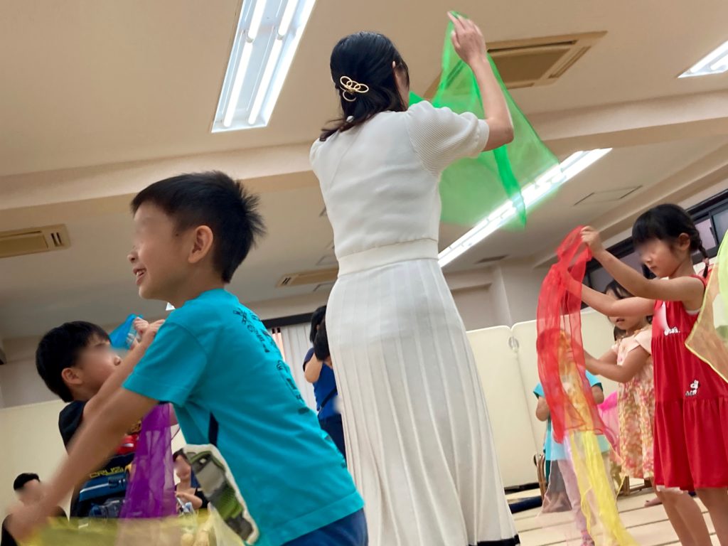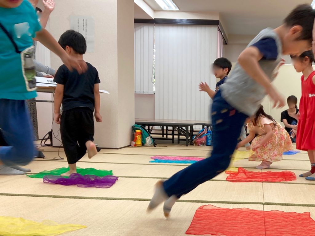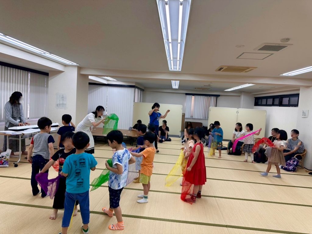 音を聞き分けて体を動かすリトミックでは、動物を表現したり、リズムに合わせてカラー布を揺らしたりしました。