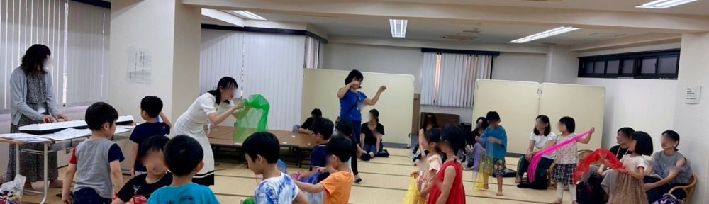 音を聞き分けて体を動かすリトミックでは、動物を表現したり、リズムに合わせてカラー布を揺らしたりしました。